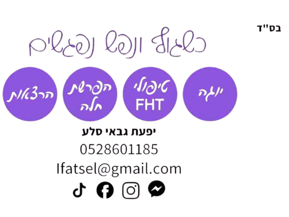 "כשגוף ונפש נפגשים" הוא קליניקה טיפולית ייחודית בפתח תקווה, הפועלת לפי שיטת FHT שפותחה ע"י הרב פנגר שליט״א. שיטה זו מבוססת על עקרונות רוחניים של הבעל שם טוב: הכנעה, הבדלה והמתקה – תהליך מובנה שמסייע בזיהוי שורש הבעיה, התבוננות עמוקה ושחרור – ליצירת מציאות חדשה ומרפאה. הטיפול מתבצע תוך חקירה בעזרת שאלון אישי, במטרה להגיע לשחרור חסמים רגשיים, טראומות, חרדות, דיכאון, בעיות בזוגיות, פוריות, ביטחון עצמי ועוד. הטיפול מתקיים בקליניקה או בזום – בפורמט אישי או זוגי – ותמיד באווירה תומכת, רגישה ומכילה. סדרת טיפולים קצרה יכולה להוביל לפריצת דרך משמעותית כבר מהפגישה הראשונה.